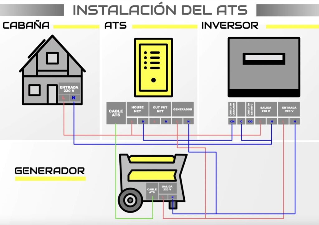 El contacto se conecta a la caja de maniobras ATS, que es la encargada de arrancar el generador. El inversor detectará cuando las baterías de la instalación solar están cargadas y producirá un nuevo contacto al ATS, el cual detendrá el generador hasta que se envíe nuevamente una señal de carga.