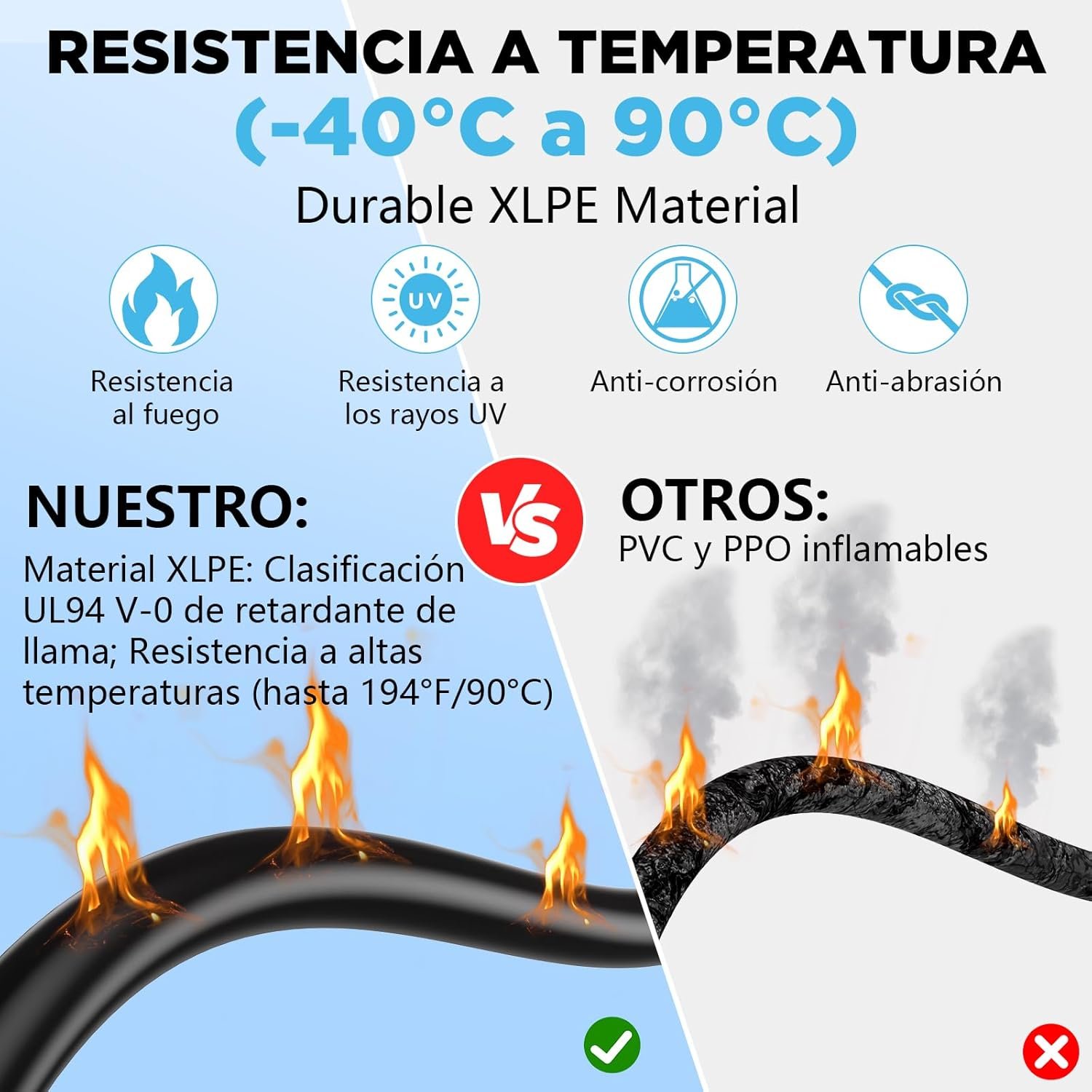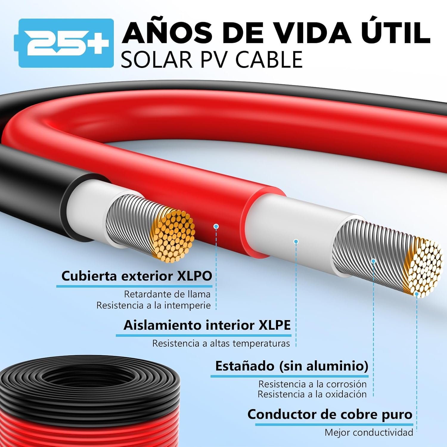 La cubierta interior de XLPE y el revestimiento exterior de XLPO proporcionan una protección térmica, mecánica y eléctrica superior. Soporta temperaturas desde -40 °C hasta +90 °C, lo que lo hace ideal para climas extremos y exposición directa al sol.